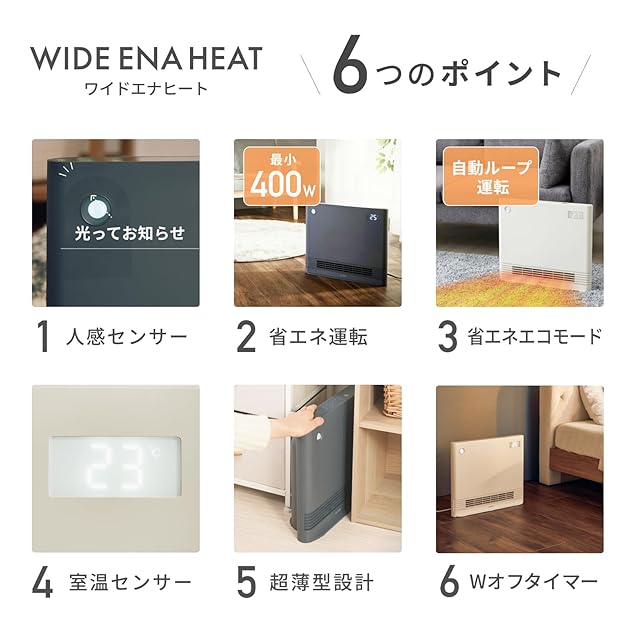 ■【電気代を抑えながら賢く使う省エネヒーター】 最小消費電力を400Wに抑え、電気代を抑えながらお使いいただける『省エネ運転』、最大1200Wの大風量のパワフル運転でお部屋全体をあたためることができる『パワフル運転』を搭載。 使用シーンに合わせて賢く使えるセラミックヒーターです。