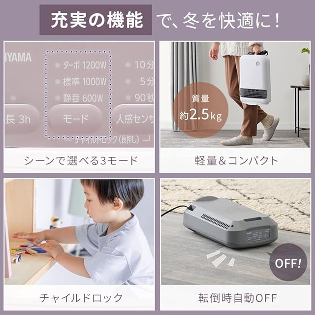 ◆3つの安全装置。転倒時安全装置:傾いたとき・転倒したときには、傾きセンサーが検知して運転を停止します。切り忘れ防止機能:運転時間が3時間を経過すると、運転を停止して電源が切れます。チャイルドロック:子どものいたずらによる事故などを防ぐためにチャイルドロックをかけることができます。