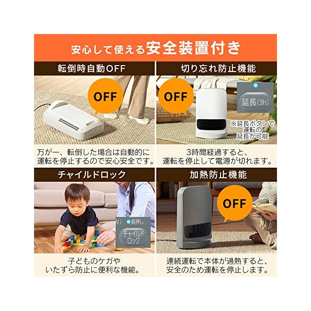 転倒時自動OFFや過熱防止機能など安心して使える安全装備付き。