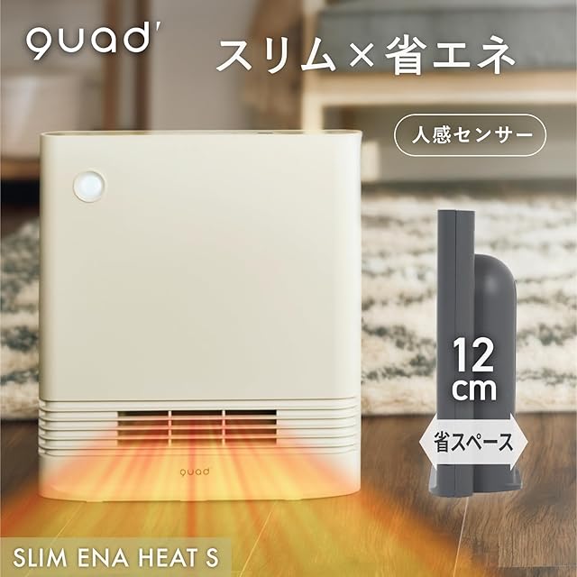 QUADS(クワッズ) 薄型 省エネ セラミックヒーター スポット暖房 1200W 大風量 スリム 光る 人感センサー エコ コンパクト 小型 速暖 電気ヒーター 電気ストーブ SLIM ENA HEAT S スリムエナヒートS (アイボリー)