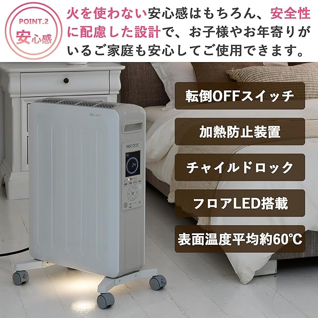 【快適なあたたかさ】風やニオイがなく音も静かで空気を汚さず清潔な暖房ができるので、小さいお子さまやお年寄りのいるご家庭にもぴったりです。やさしく自然な暖かさが心地よく広がります。