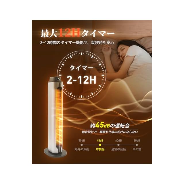 【付属のリモコン&9時間タイマー機能&低騒音操作】新しくアップグレードされたーセラミックヒーターは、45dB以内の騒音で動作し、一晩中静かで暖かい環境で眠らせる超静かな機器です。タイマー機能を備え、2時間から12時間までの自動シャットダウン機能により、エネルギー効率が更に向上し、環境にも配慮します。2 つの操作モード、ボタン操作に加えて、専用リモコンが付属しており、遠隔操作が可能。便利です。