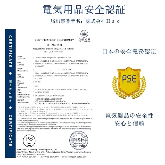 【期間12ヶ月】:ZAPJQL電気ストーブ 期間12ヶ月,PSE認証も取得しておりますので、安心してお使いいただけます