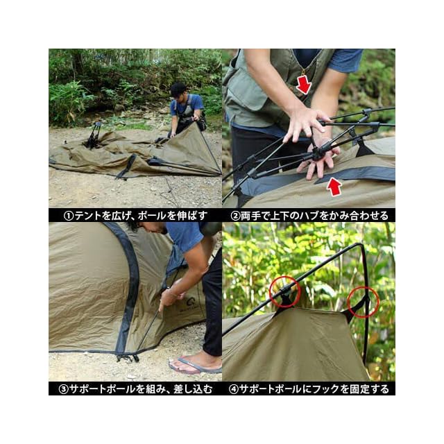 <b>[商品スペック]</b><br>●対応人数 : 1人用<br>●対応シーズン : 4シーズン(春夏秋冬)<br>●展開サイズ(外寸) : 約230cm×90cm×90cm<br>●収納サイズ : 約52cm×17cm×17cm<br>●重量 : 約3kg<br>●素材 :<br> ポール:アルミニウム合金(#7001)<br> フライシート:ポリエステル<br> インナーテント:通気性ポリエステル<br> 床面:ポリエステルオックスフォード<br>●耐水圧 : 3000mm<br>●付属品 : キャリーバッグ、スチールペグ、ガイロープ、グランドシート<br><b>[商品詳細]</b><br>【商品特徴】<br>・バイクの荷幅制限(車体+左右15cm以内)にも十分対応する52cm幅コンパクト収納。<br>・軽量で強度の高いアルミフレーム採用で重量わずか3kg。<br>・設営は1人でも簡単ワンタッチ式60秒。<br>・自立するので避難時の室内利用にも対応。<br>・居住性を高める追加フレーム。<br>・結露を防ぐインナーテント付き。<br>・説明書はバッグに縫い付け 設営動画あり。<br>・1シーズン(180日)の製品付き。<br><br>【こんなシーンにおすすめ】<br>アウトドア ツーリング バイク 自転車での旅行 ソロキャンプ フェス 非常時 防災用のテントとして。<br><br>【購入時のご注意】<br>・ご使用時は説明書をよく読んでから設営ください。<br>・石の多い場所などで利用する場合はグラウンドシートの使用をお勧めいたします。<br><br>【180日間の製品】<br>初回お届け日から180日間、適切な使用方法及び用途において製品に起因する不具合が発生した場合、無償で修理もしくはパーツ交換等対応いたします。