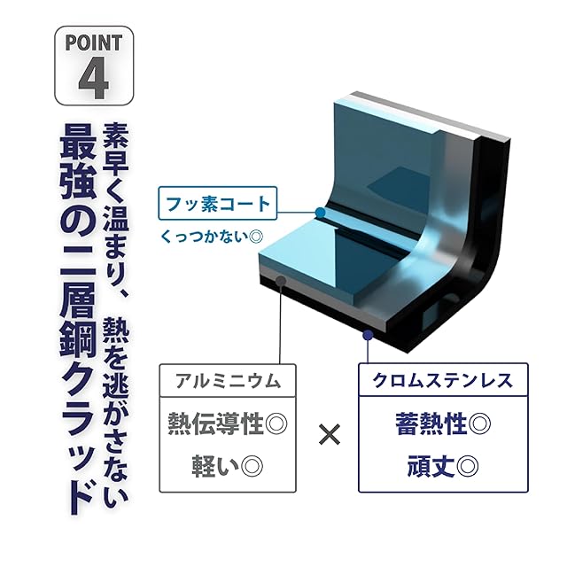 材質/2層クラッド(外ステンレス+内アルミニウム)内面2コートフッ素樹脂加工