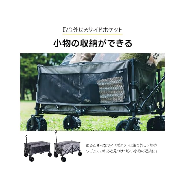 <b>[商品スペック]</b><br>●ブランド名 : QUICKCAMP(クイックキャンプ )<br>●メーカー品番 : QC-CW190<br>●展開サイズ :<br> 約幅104×奥行63×高さ111cm<br> ※タイヤ込み、高さは屋根の頭頂部までの高さです。<br>●荷台サイズ :<br> 外寸:約幅95.5×奥行58×高さ40.5cm<br> 内寸:約幅88×奥行50×高さ39cm<br>●収納サイズ : 約幅38×奥行27×高さ62cm<br>●耐荷重 : 約100kg<br>●構造部材 :<br> フレーム:金属(鋼)<br> 表面加工:フレーム-粉体塗装<br> 張り材:ポリエステル<br> タイヤ:ポリ塩化ビニル<br>●重量 : 約12.5kg<br>●内容品 :<br> ・ワゴン本体×1<br> ・タイヤ×4<br> ・サンシェード(屋根+カーテン)×1<br> ・ラバーバンド×1<br> ・収納カバー×2(ワゴン本体用、サンシェード用)<br> ・底敷き×1<br>●生産国 : 中国<br><b>[商品詳細]</b><br>屋根&カーテン付きで、大切な荷物を日差しや雨からシャットアウト!<br>おでかけのワクワクとドキドキをはこぶ大容量キャリーワゴン。<br>【商品特徴】<br>・組み立て不要で展開も収納も簡単。<br>・取り外し可能なカーテン&屋根付き。<br>・荷物の目隠しにもなるカーテンは巻き上げも可能。<br>・屋根は急な雨でも安心の撥水仕様。<br>・タイヤが外せ、お家⇔車⇔屋外へそのまま持ち運ぶことが可能。<br>・悪路でも走行しやすいワイドホイール。<br>・タイヤは坂道でも安心のロック付き。<br>・デイキャンプやピクニックの荷物が一気に沢山運べる160L大容量サイズ。<br>・子供の靴など、小物収納に便利なメッシュのサイドポケット付き。...