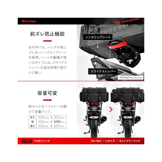 バッグの前ズレや荷崩れ防止、乗降時の妨げになりにくい形状、非使用時のコンパクト性などアイデア満載のPRO仕様