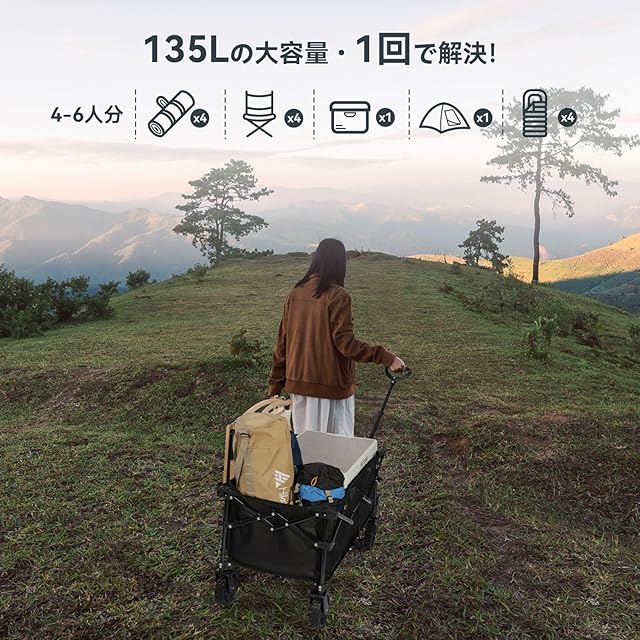 HIKENTURE キャリーワゴン 【大容量135L・耐荷重150㎏】アウトドアワゴン 【スイベル・ブレーキ付き】キャンプ カート 特許取得のコンパクト設計 キャンプカート ワンタッチ収束型 自立式ハンドルデザイン キャンプ キャリー レジャー BBQ 運動会 荷物運び 引っ越し