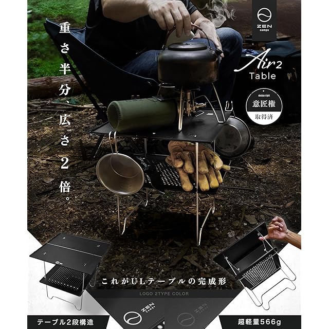 ZEN Camps Air-2 Table アウトドアテーブル ソロキャンプ コンパクト 折り畳み式 アルミニウム 超軽量566g (ブラック・ブラックロゴ(本体))