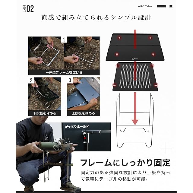 重さ半分、広さ2倍をコンセプトに作られた超軽量 X2段テーブル 「Air-2 Table」 これぞ軽量テーブルの完成形。ちょっとしたアウトドアやソロキャンプにおすすめです。