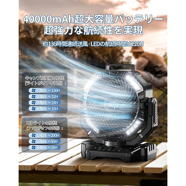 ⭐【40000mAh大容量・220時間持続するLEDライト】キャンプ 扇風機は40000mAhの超大容量リチウムイオンポリマー電池を内蔵しています。フル充電の場合、扇風機で最大60時間、LEDライトで最大200時間の航続が可能です。16個のLEDライトで周囲を明るく照らします。キャンプ 扇風機は暗闇の中ランタン代わりに使える3段階切り替えLEDを完備しています。シーンに合わせた明るさ設定が可能です。