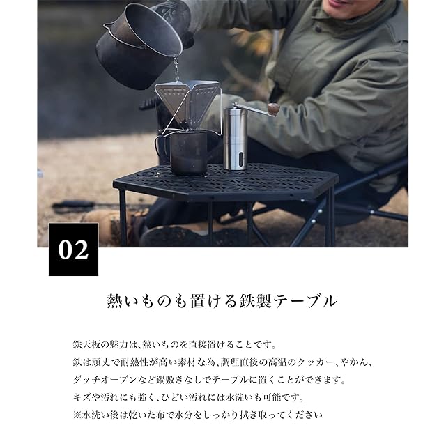 【熱いものも置ける鉄製テーブル】 鉄天板の魅力は、熱いものを直接置けることです。 鉄は頑丈で耐熱性が高いので調理直後の高温のクッカー、やかん、ダッチオーブンなどを鍋敷きなしでテーブルに置くことができます。 傷や汚れにも強く、ひどい汚れには水洗いも可能です。 ※水洗い後は乾いた布で水便をしっかり拭き取ってください。
