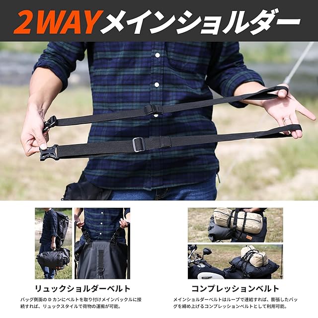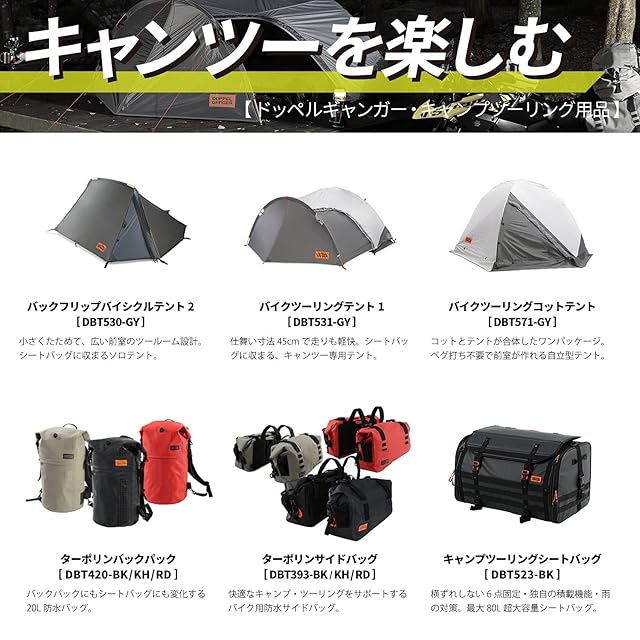 コンセプト: バイクで楽しむキャンプ・ツーリングのために開発された、全天候型の大容量防水シートバッグ。パッキングスキルに左右されず、ビギナーでも固定できるパッキングベルトシステムを備えた、ドッペルギャンガーのモータサイクルバッグです。