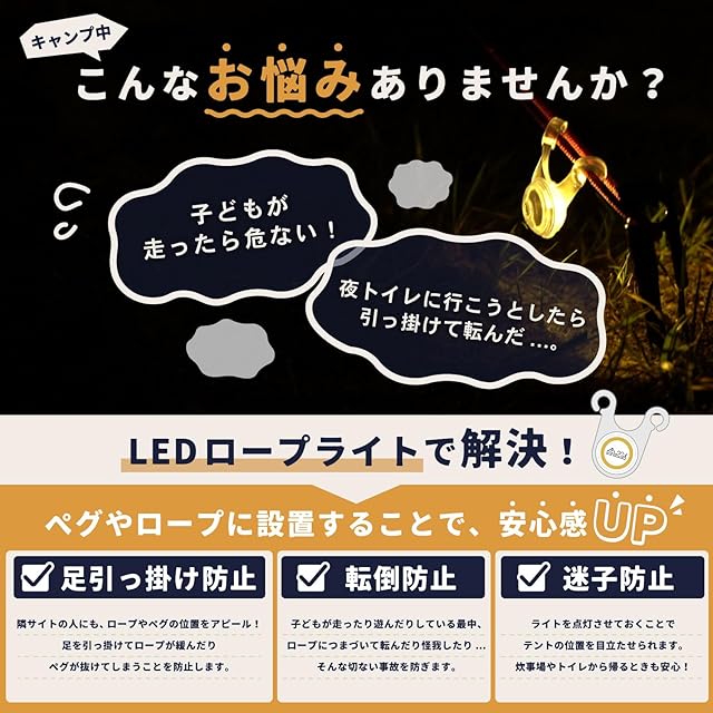 <夜間の転倒防止>夜間の光の無い所ではテントやタープのロープが見えづらく、足を引っかけてしまいとても危険です。しかしロープライトを設置していれば、どこにロープが張られているか直ぐに確認できます!ロープのどこの位置でも設置する事が出来きるので、どなたでもご使用いただけます。灯りのない大自然の中のキャンプには必須のアイテム!