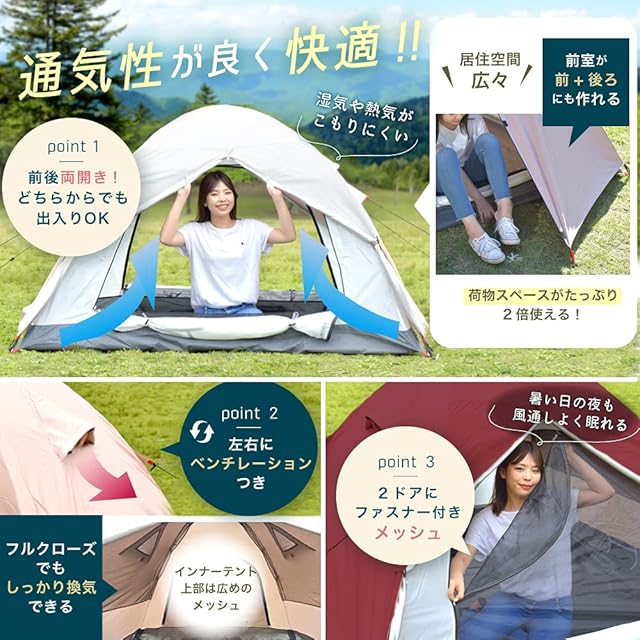✅【軽量・コンパクト!】バイクの荷物積載に配慮された、軽量でコンパクト収納サイズ!持って行ける荷物の制限があるツーリング&キャンプに最適です。✅【通気性がよく快適!!】① 前後ドア両開きでどちらからも出入りOK!② 左右にベンチレーションつき!フルクローズしてもしっかりテント内を換気、しかもテント上部は広めのメッシュ構造でさらに通気性をアップ!③ 前後ドアともファスナー付きメッシュで暑い日の夜も風通しよく眠れる快適さ!✅【居住空間!広々!】前室が前にも後にも作れて、荷物スペースとして3倍使えます。