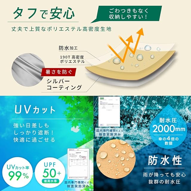 ✅【抜群の紫外線カット / 雨水を通さない防水性】生地には耐久性に優れた190Tのポリエステルを採用!裏面には遮光性を高めるシルバーコーティングが施されてるため、日焼けの原因となる紫外線を99%カットし、紫外線遮蔽率はUPF50+を実現。いかなる天候にも耐え、色あせやひび割れ、摩擦に強く、強度、耐久性を備えています。✅【耐水圧2000mm】テントの性能を表す耐水圧は大雨に耐えられる2002mmもあるので、急な雨や夜露で生地が濡れる心配もありません。また通気性もよく、湿気は適度に外に逃すため、悪天候対策と快適な居住空間の確保を同時に叶えます!