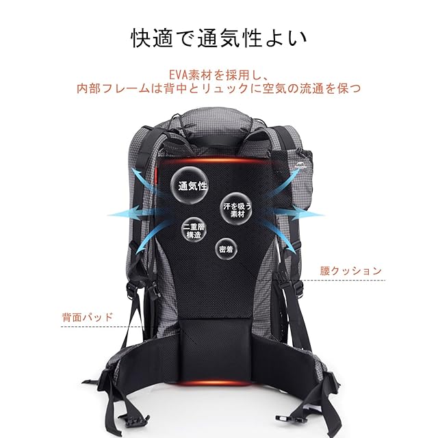 【人間工学デザイン】人間工学に基づいて設計された背面パッドと肩クッションは、絶妙な厚さで肩への食い込みを軽減。背面パッドは通気性に優れたメッシュクッションの構造で、長時間使用してもムレにくく快適に着用が可能。パックの背部はフレーム構造を備え、チェストベルトとウェストベルト付き、重量を全身で分散するので背中や両肩への負担を軽減します。長時間背負っても疲れにくく、快適な背負い心地を確保します。アウトドアに最適です。
