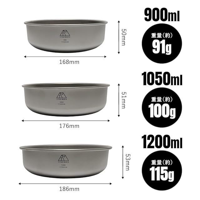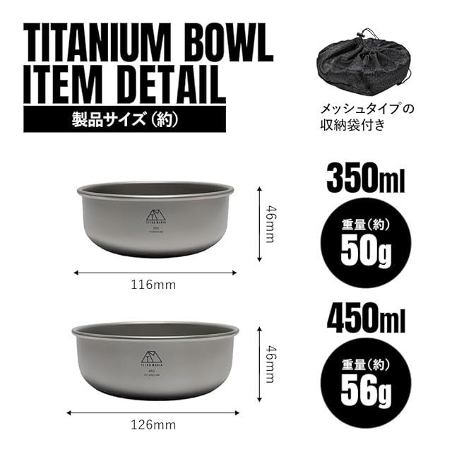TITAN MANIA(チタンマニア) ボウル 全てのサイズが綺麗にスタッキング出来る 軽量 皿 お茶碗 食器 セット キャンプ ソロキャンプ アウトドア用品 キャンプ用品 収納袋付き (1050ml)