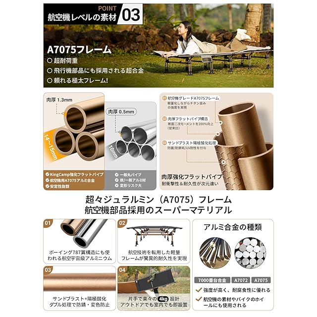 【航空級素材で高耐久】フレームは7075航空機レベルのアルミニウム合金を採用する。軽量で錆に強く、高強度と耐久性を両立する。ベッド面は420D防撕裂加工オックスフォード生地を使用し、優れた耐磨耗性と適度な張りで快適な寝心地を提供する。