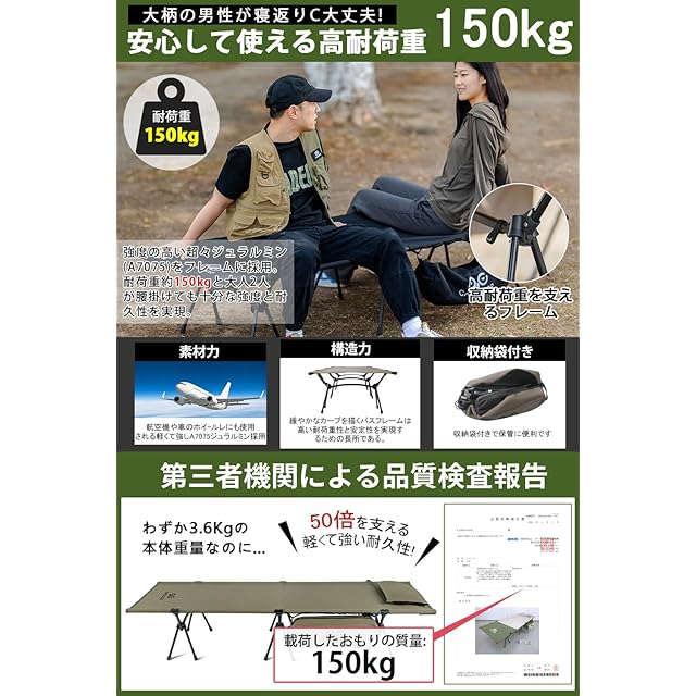 ✅【日本国内の耐荷重検査合格済み】フレームには航空機にも使用される強度の高いJIS規格適合の”A7075(超々ジュラルミン)”を採用することで耐荷重”150kg”を実現しました。また国内の試験機関にて24時間の耐荷重試験を行っておりますので、お子様から大人の方まで安心してご使用頂けます。✅【アウトドアでまるでベッドのような寝心地を。】CAMDOOR 2WAY フォールディングコット ワイドは、地面から距離を取ることでフィールドのコンディションに左右されず 1000Dナイロン製のベッドシートが程よく沈み込むことで、キャンプでのお昼寝や夜の睡眠を今以上に快適にします。✅【地面の凸凹に左右されないコット キャンプ 2way】地面から距離をとることで、フィールドが芝生でも、砂場でも、石混じりのサイトでも 凸凹を感じることなくいつでも快適に眠ることが可能に。マットで眠るのとはまた違うコットスタイルをお楽しみください。