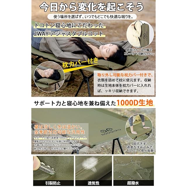 ✅【1000D高密度撥水生地&軽量コット史上最高の静音性能を実現】1000Dオックスフォードの耐久性が優れ、登山、花火大会 、運動会、お花見などの日常行事に限らず、防災など緊急の場合も大活躍します。長期間使っても丁度良い弾力性、落色や変形等しませんので10年以上使用寿命もあります。また、生地の厚みが増したことで耐久性と地面からの冷気と暖気をシャットダウンする性能がアップしました。✅【コット 軽量史上最高の静音性能を実現】従来のコットでは就寝時の寝返りでギシギシと音が気になって眠れないという悩みがつきものですが、camdoor コットは生地とフレームの摩擦係数を可能な限り減らすことに成功。従来品に比べ大幅に静音性能が向上しました。
