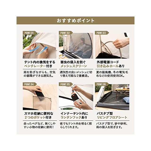 ■選ぶ際のおすすめポイント ・テント内の換気をするベンチレーター付き 雨を防ぎながらも、テント内の空気の循環ができるベンチレーター(通気孔)はリビングルームの先端に2か所あります。 ・害虫の侵入を防ぐメッシュスクリーン 寝室の出入り口は、通気性の良いメッシュスクリーンに切り替えできる 2重構造ドア。後方にも、メッシュ窓がありタッセルで開けたままにすることができます。 ・外部電源コード引き込みホールあり 夏の扇風機、冬の電気毛布などの使用も、寝室の出入り口を閉めた状態で使用できます。