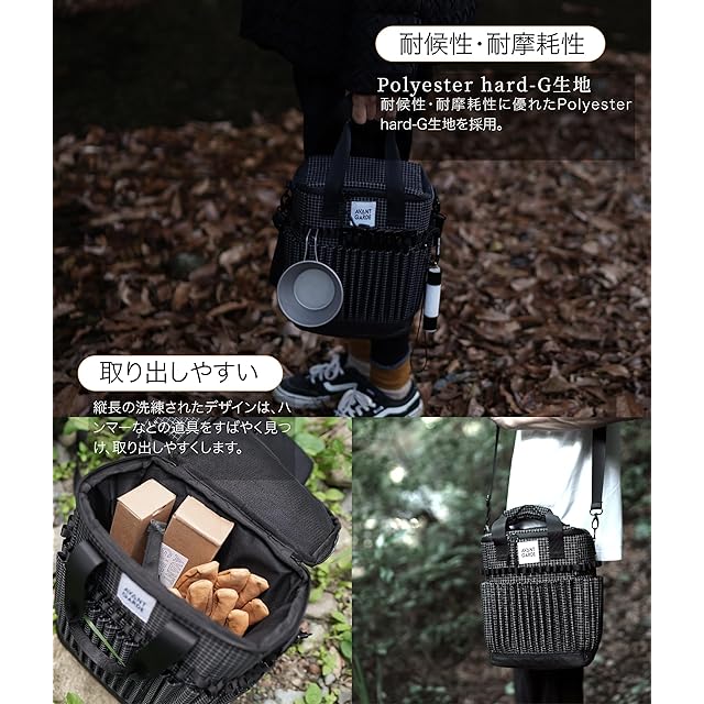 【縦型デザインで出し入れ簡単】縦型設計により、バッグを地面に立てたままでもペグ・ハンマー・斧などのツールをスムーズに出し入れ可能。キャンプサイトでの設営や撤収を効率的にサポートします。収納力とアクセス性に優れ、ひとつのバッグで多くの作業をカバーできる万能性が魅力です。