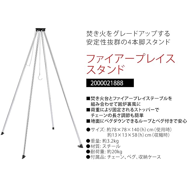 【使用シーン】アウトドアやキャンプ、バーベキューなどで焚き火台と組み合わせて使用することで、ダッチオーブン料理やケトルでの湯沸かしなど焚き火調理のバリエーションが広がるスタンドです。