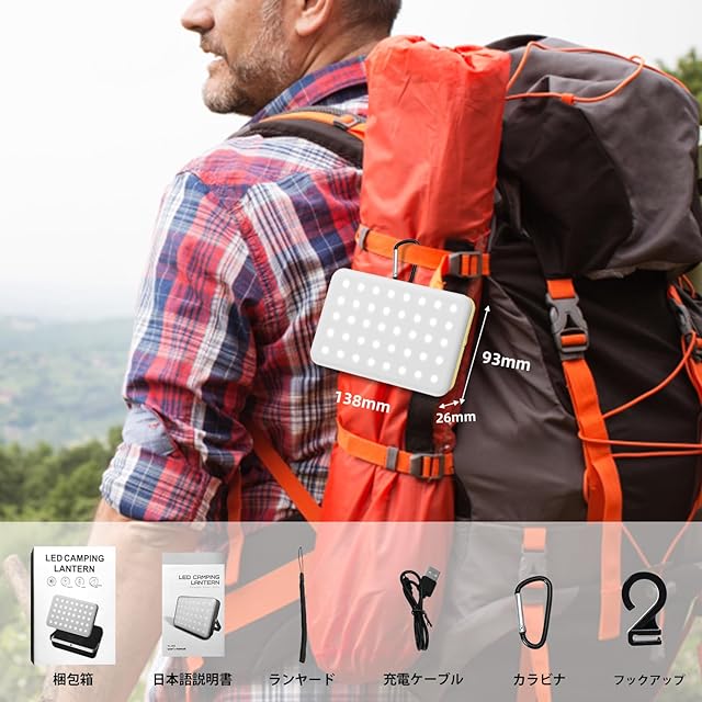 【パッケージ内容 適用シナリオ】:LEDランタン×1、充電ケーブル×1、カラビナ×1、吊り下げリング×1、日本語マニュアル×1。 LEDランタンは、キャンプ、アウトドア、釣り、登山、旅行、テントライトの吊り下げに非常に適しており、停電、地震、非常、防災などの非常灯としても使用できます。