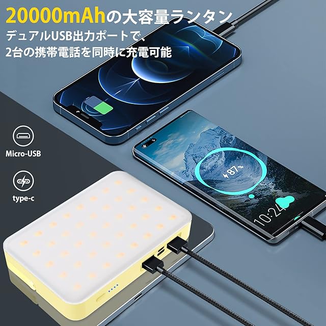 【20000mah大容量ランタン】キャンプ用ランタンには20000mahのポリマーバッテリーが内蔵されており、Type-cとMicro USB入力ポートの定格入力は5V2Aです。 緊急時にUSB出力ポートを介して2台の携帯電話を同時に充電できる2つのUSB出力ポート。