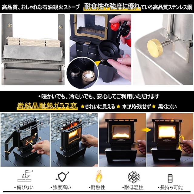 材質:ストーブ本体は高品質ステンレス鋼を採用、特徴が耐食性に優れていて錆びることなく、強度高く、耐熱性及び耐低温特性に優れております。また、素材に銅と搭載し、高品質な素材で耐久性に優れております。窓は微結晶耐熱ガラスを採用、熱に強く、何時までもきれいに見え、ホコリを残さず、黒ずみにくく、清潔に保つことができます。