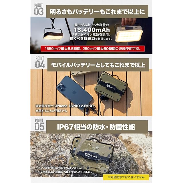 ✔【モバイルバッテリー機能つきLEDランタン】WAQ LEDランタンは最大輝度1650ルーメン・バッテリー容量13400mAhのハイスペックLEDランタンです。ランタンとしては最小クラスのコンパクトさながら、モバイルバッテリー機能付きで停電や災害時の防災にも役立ちます