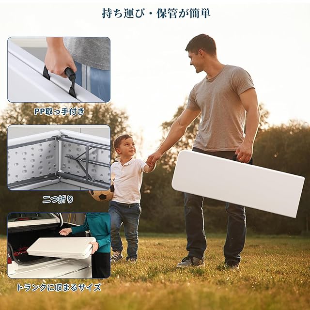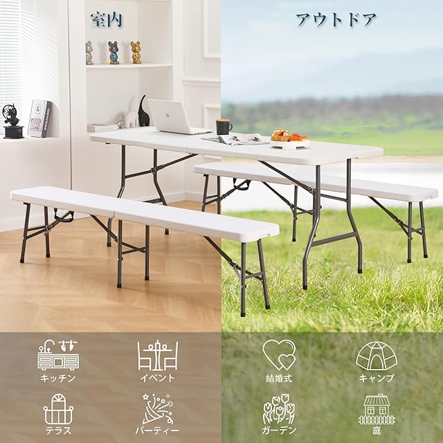 BOOSDEN 折りたたみ式ベンチ 185x30x42cm アウトドアベンチ ガーデンベンチ 長椅子 ハーフベンチ コンパクト 組立不要 スツール 軽量 屋外 庭 イベント用 ホワイト