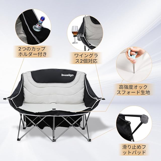 【多様な使用シーン】快適性・機能性・携帯性を兼ね備えたアウトドア用折りたたみ2人掛けチェア。庭先・キャンプ・スポーツ観戦など様々な場面で活躍