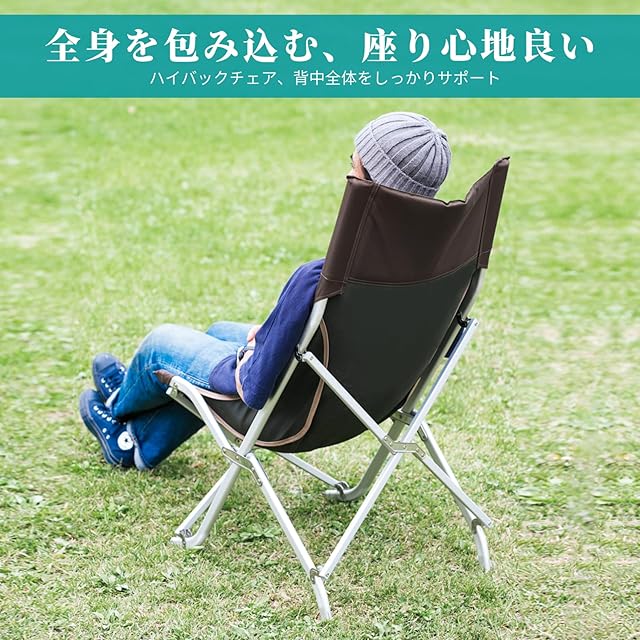 【アウトドア用ハイバック】キャンプやハイキングなどアウトドア用に設計されたハイバックチェアは、肩までしっかりサポート。長時間の使用でも快適な座り心地をキープします。