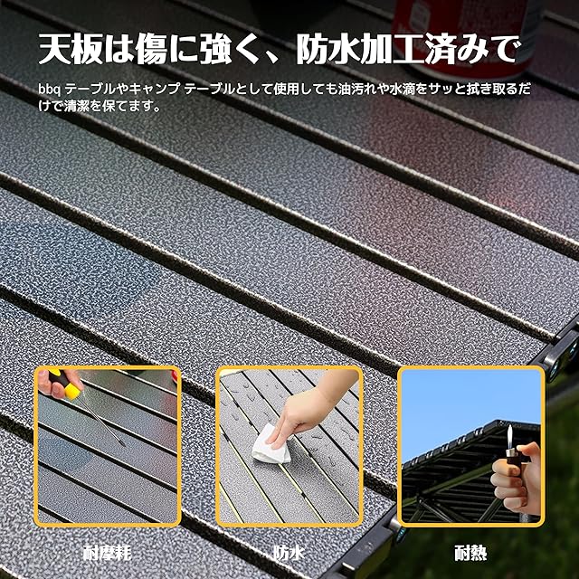 【安定感抜群の耐久構造】 厚みのあるスチールフレームと交差構造により高い安定性を実現。最大80kgの耐荷重で大人が使用しても安心。天板は傷に強く、防水加工済みで、bbq テーブルやキャンプ テーブルとして使用しても油汚れや水滴をサッと拭き取るだけで清潔を保てます。