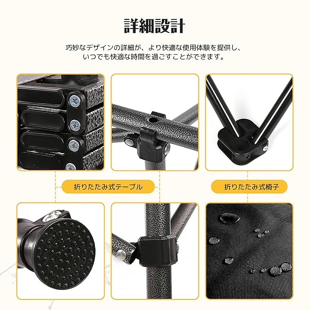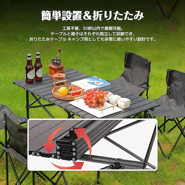 【簡単設置&折りたたみ】 工具不要、30秒以内で展開可能。テーブルと椅子はそれぞれ独立して収納でき、折りたたみテーブル キャンプ用としても非常に使いやすい設計です。