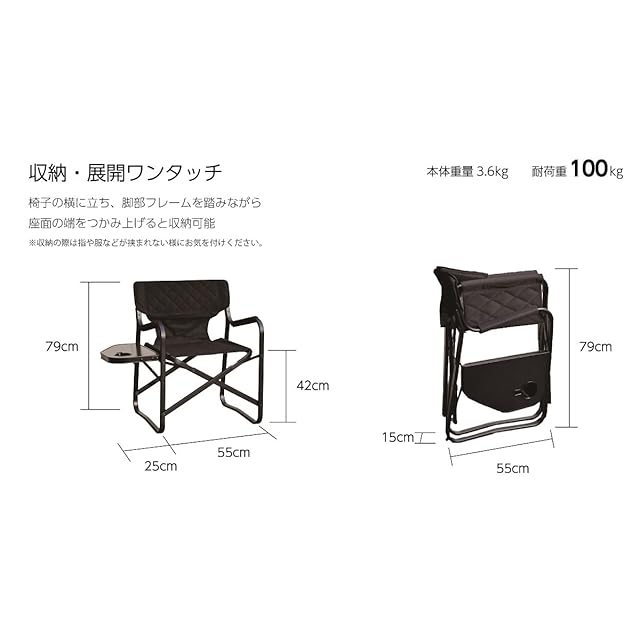 使用時:幅80 x 奥行54 x 高さ78cm 収納時:幅15 x 奥行54 x 高さ78cm 座面高:約42cm 重 量:3.6kg 耐荷重:100kg 素 材:フレーム/アルミ合金・アルマイト 座面/ポリエステル1200デニール 肘掛/発泡ウレタン・ポリエステルカバー