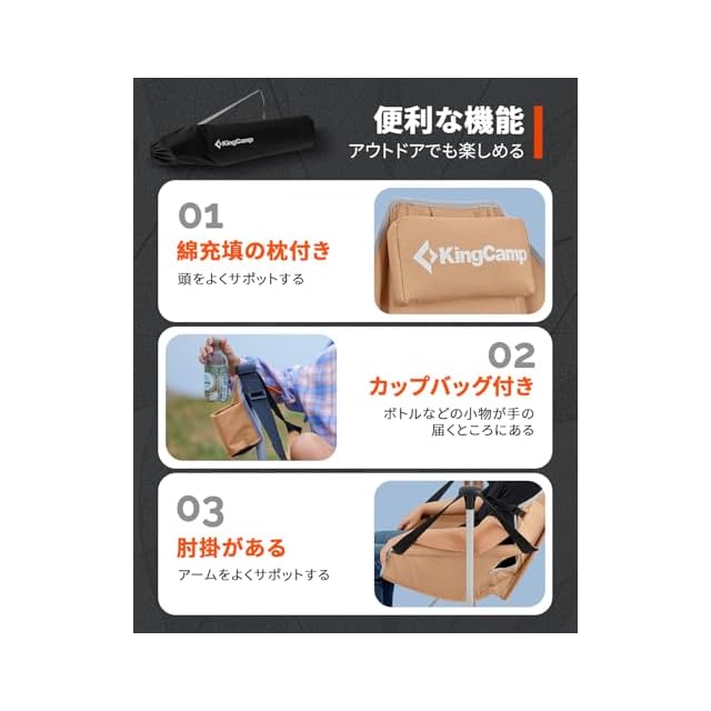 【2WAY・多目的使用】取り外し可能なフットレストが付属しており、取り付けると角度を調整することで休憩や睡眠のリクライニングチェアとして使用でき、取り外すとピクニックや釣りなどのアウトドアチェアとして使用することができます。