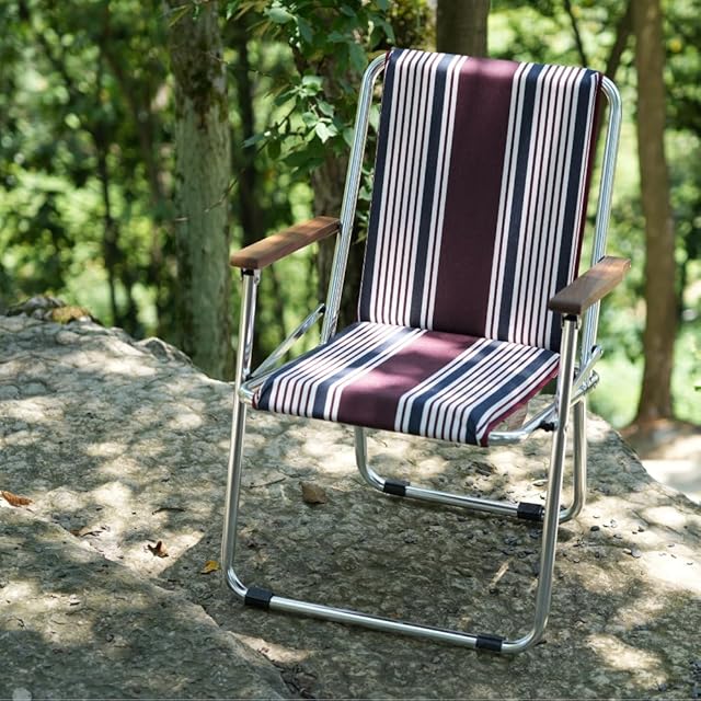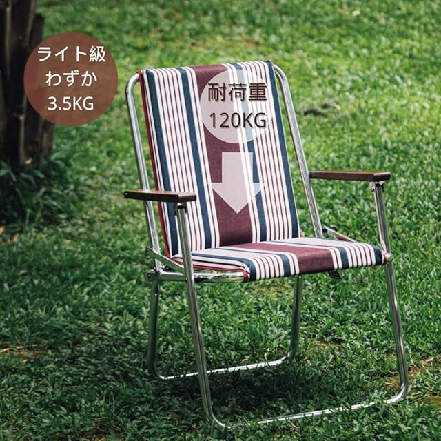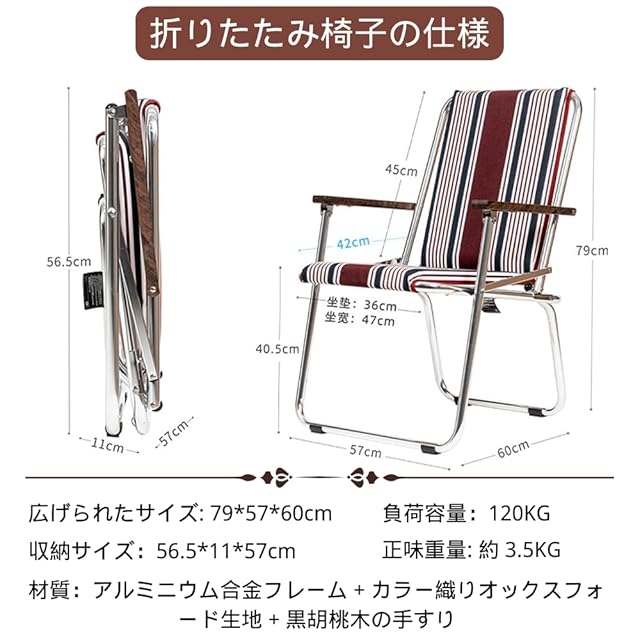デザイン: このキャンプ用折りたたみチェアは、レトロなストライプ柄が特徴です。アルミニウム製フレームとブラックウォルナットの肘掛けが、高級感のあるデザインを演出しています。