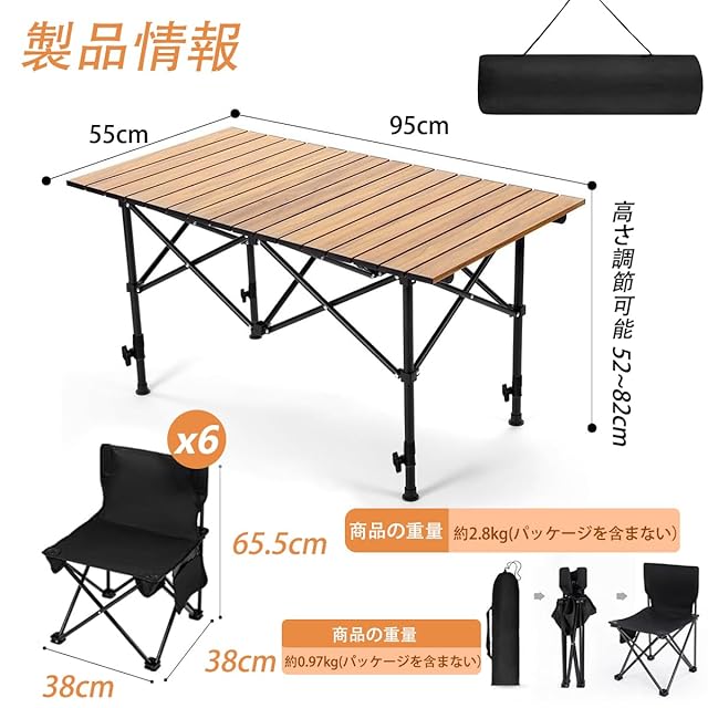 HEEOREV アウトドア テーブル チェアセット キャンプ テーブル 7点セット(size:95x55x52~82CM)高さ調節可能 屋外用折りたたみ椅子 折りたたみテーブル キャンプ バーベキュー 持ち運び便利 軽量 防災 アウトドア キャンプ 釣り ピクニック バーベキュー キャンプ用品 (収納袋x1、机x1、折り畳み椅子x6) (木の色)