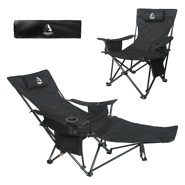 ARURUリクライニング キャンプチェア ポータブル折りたたみラウンジチェア フットレスト&調節可能な背もたれ付きンド 保冷パック カップホルダー&収納バッグ付き 大人用 頑丈