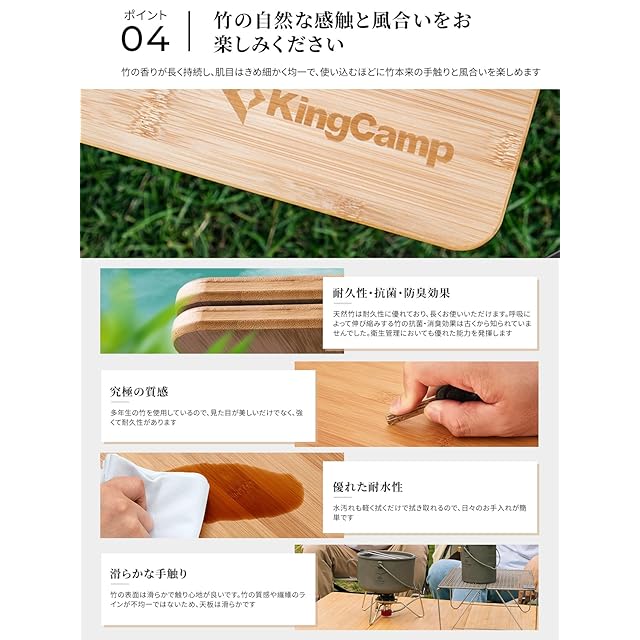 【高級な天然竹製天板】このキャンプ テーブルの天板には、自然の美しさと耐久性を兼ね備えた楠竹を使用しています。12の工程を経て、熟練の職人たちが竹の特性を活かし、滑らかで美しいテーブル面に仕上げました。楠竹は、日常の使用にも十分な耐久性があり、自然な木目と独特の質感が、あなたの生活空間に自然の美しさと高品質をもたらします。