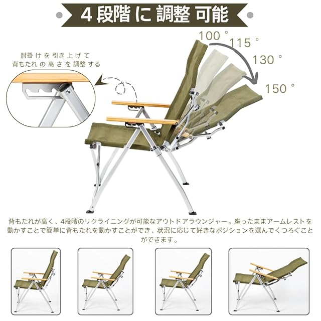 [人間工学に基づいて設計され、背もたれは4段階に調節可能で、背もたれを150°まで折りたたむことができ、普通の折りたたみ椅子のように座ったり、背もたれを折りたたんでベッドのようにリクライニングすることができます。背もたれの角度は100度から150度の間で調整できるので、様々な姿勢を快適に保つことができます。 キャンプ、キャンプファイヤーパーティー、リビングルーム、バルコニー、オフィスなど様々なシーンで様々なニーズに対応します。