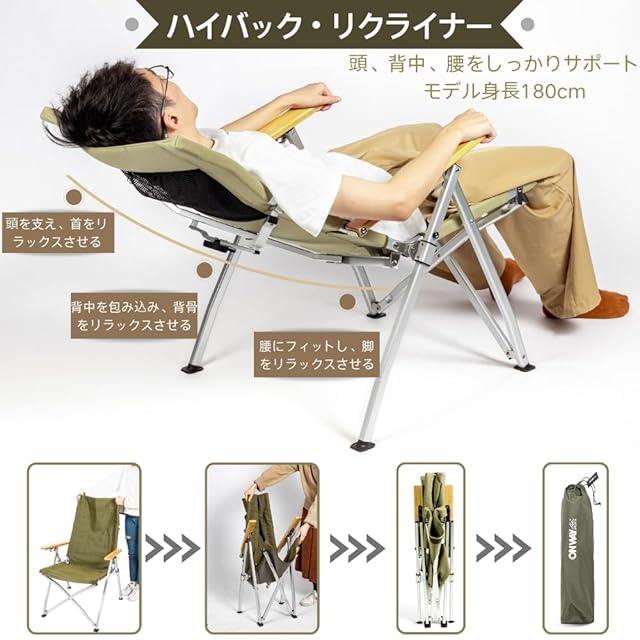 [高めの背もたれ設計で座りやすい】高めの背もたれ設計で、背もたれの高さは68cmあり、頭をしっかり支え、カバー感があり、長時間横になっても疲れません。 アウトドアチェアのシート幅は約49cmです。ハイバックチェア リクライニングの座面奥行きは48cmで、体にフィットし、包み込まれるような座り心地です。 背の高い人でも快適に使用できます。背もたれにはキャンプ用品、調理器具、スナックなどを収納できるメッシュ収納袋が付いています。