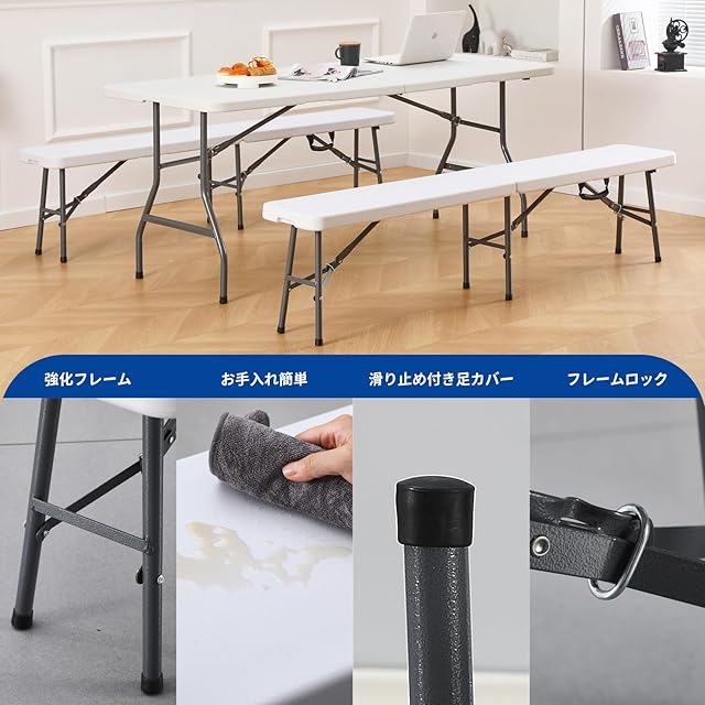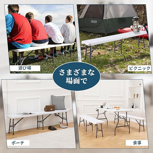 BOOSDEN 折りたたみ式ベンチ 185x30x42cm 2点セット アウトドアベンチ ガーデンベンチ 長椅子 コンパクト 組立不要 スツール 軽量 屋外 庭 イベント用 ホワイト