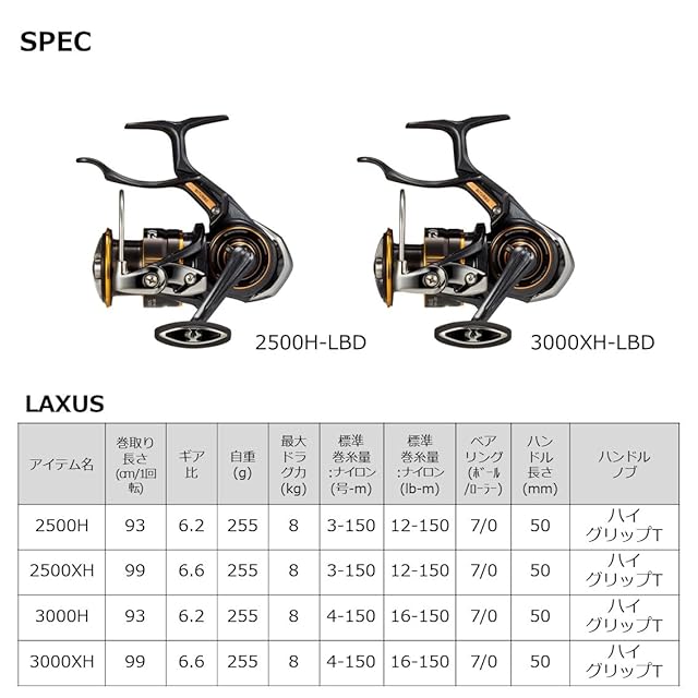 モノコックLB第二弾 ZAION Vを採用して軽量化を実現!ギア比6.2、ハンドル1回転93cm。使い易いギア比設定のオールラウンドモデル。 2500H-LBDはナイロン3号-150m、3000H-LBDはナイロン4号-150m。どちらもエコノマイザーを標準装備し、細い道糸を巻く際の底上げが可能。