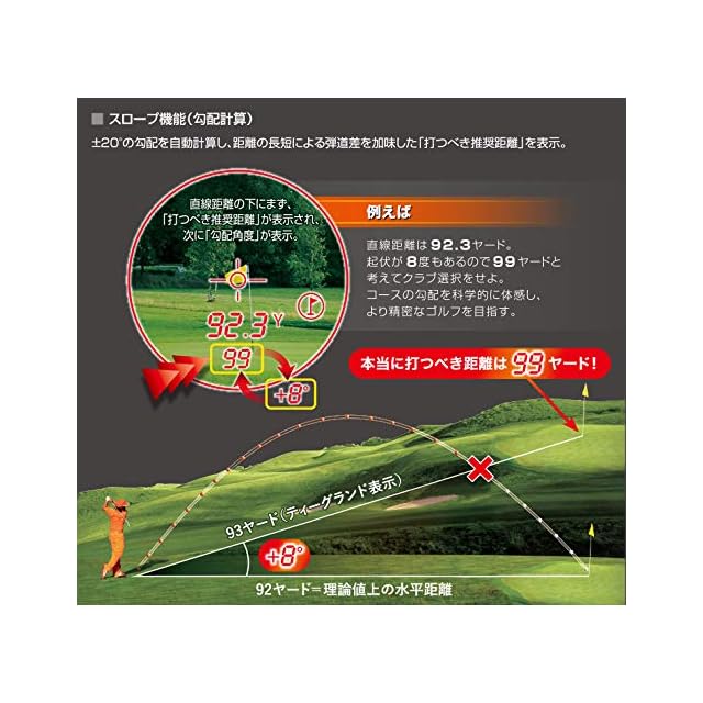 測定可能距離:5~1300ヤード・測定精度・表示単位:精度±0.5ヤード、0.1ヤード表示(5~125ヤード測定時)、精度±1ヤード、1ヤード表示(125ヤード以上測定時)・勾配角度:±20°(上げ下げ20°までの起伏)・勾配精度:±1°・モード:ピンシーカー、スロープ、ジョルト機能