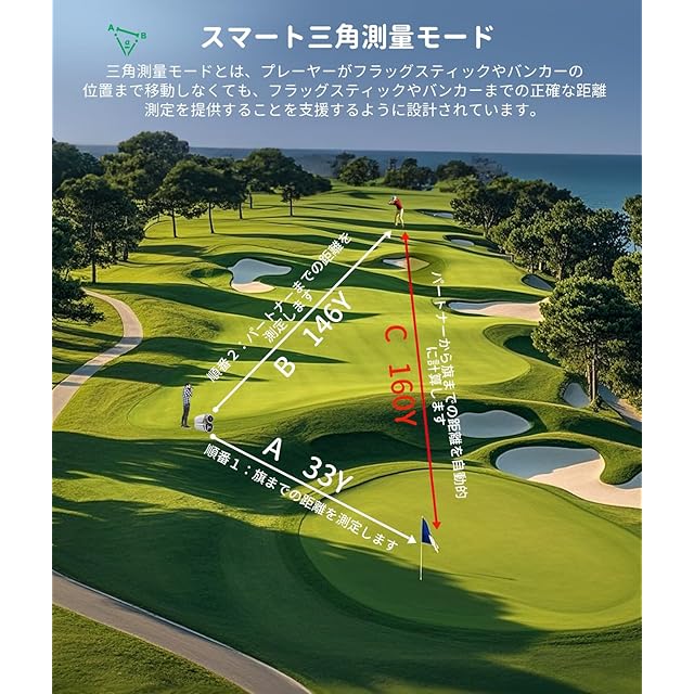 【3点間距離測定】三角測量モード付き、プレーヤーがフラッグスティックやバンカーの位置まで移動しなくても、フラッグスティックやバンカーまでの正確な距離測定を提供することを支援するように設計されており、3点間距離測定を実現♪