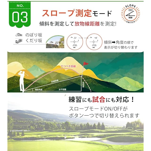 【スロープ●スイッチの速さと信頼性】スロープのON/OFFは、ゴルフトーナメントのライセンス規定に準拠することができます。スロープのON/OFFにはわずか3秒しかかかりません(「M」ボタンを3秒間長押しするだけ)。簡単で速く、時間を節約できます。ゴルフトーナメントと初心者指導の両方に使用できます。ゴルフトーナメントは、スロープをOFFにするだけでトーナメントに参加することができ、2つの製品に多くのお金を費やす必要はありません。